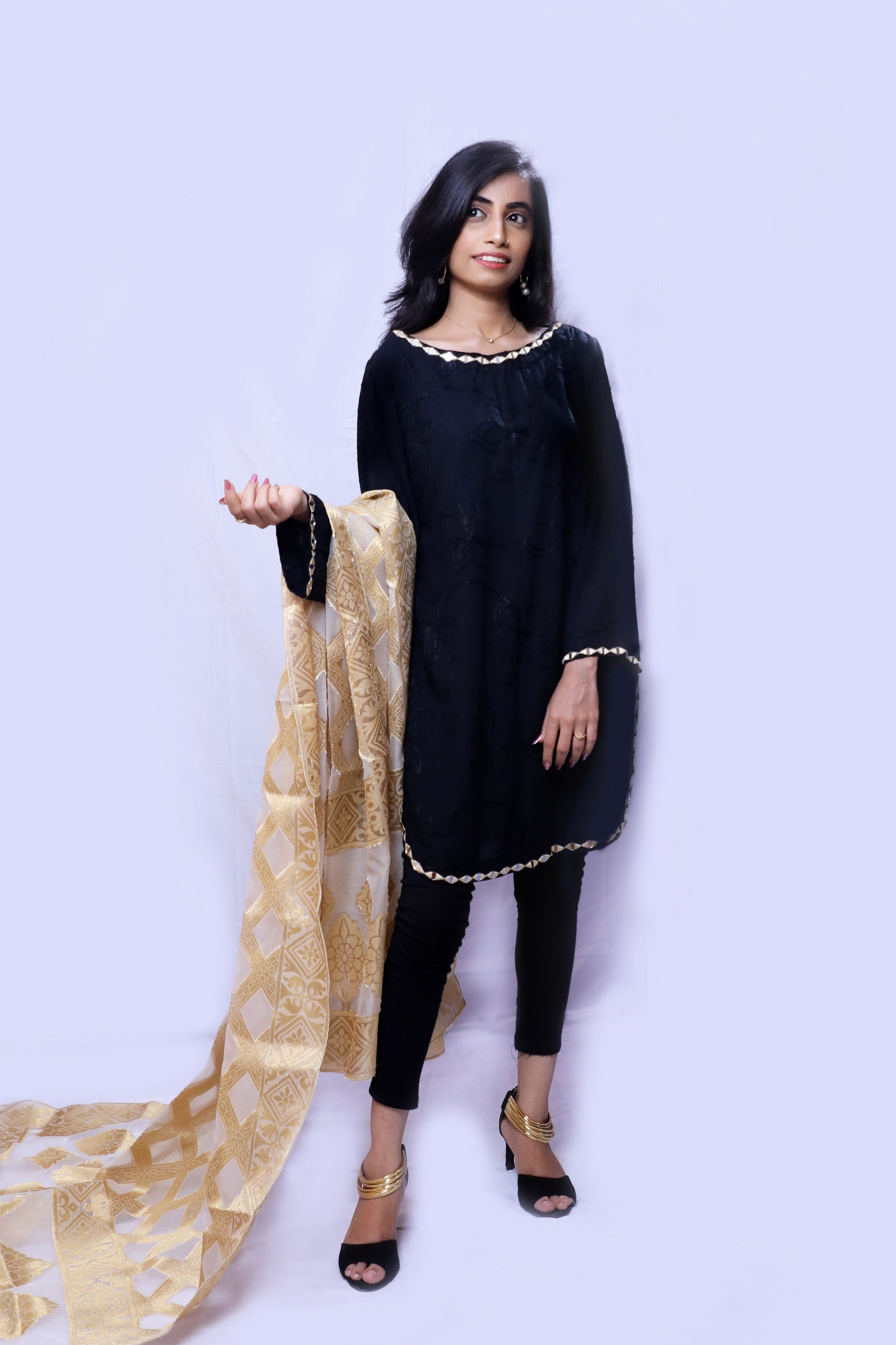 Classic stitched Black kurti with mirror work on neck, round daman and sleeves in embroidered linen fabric.