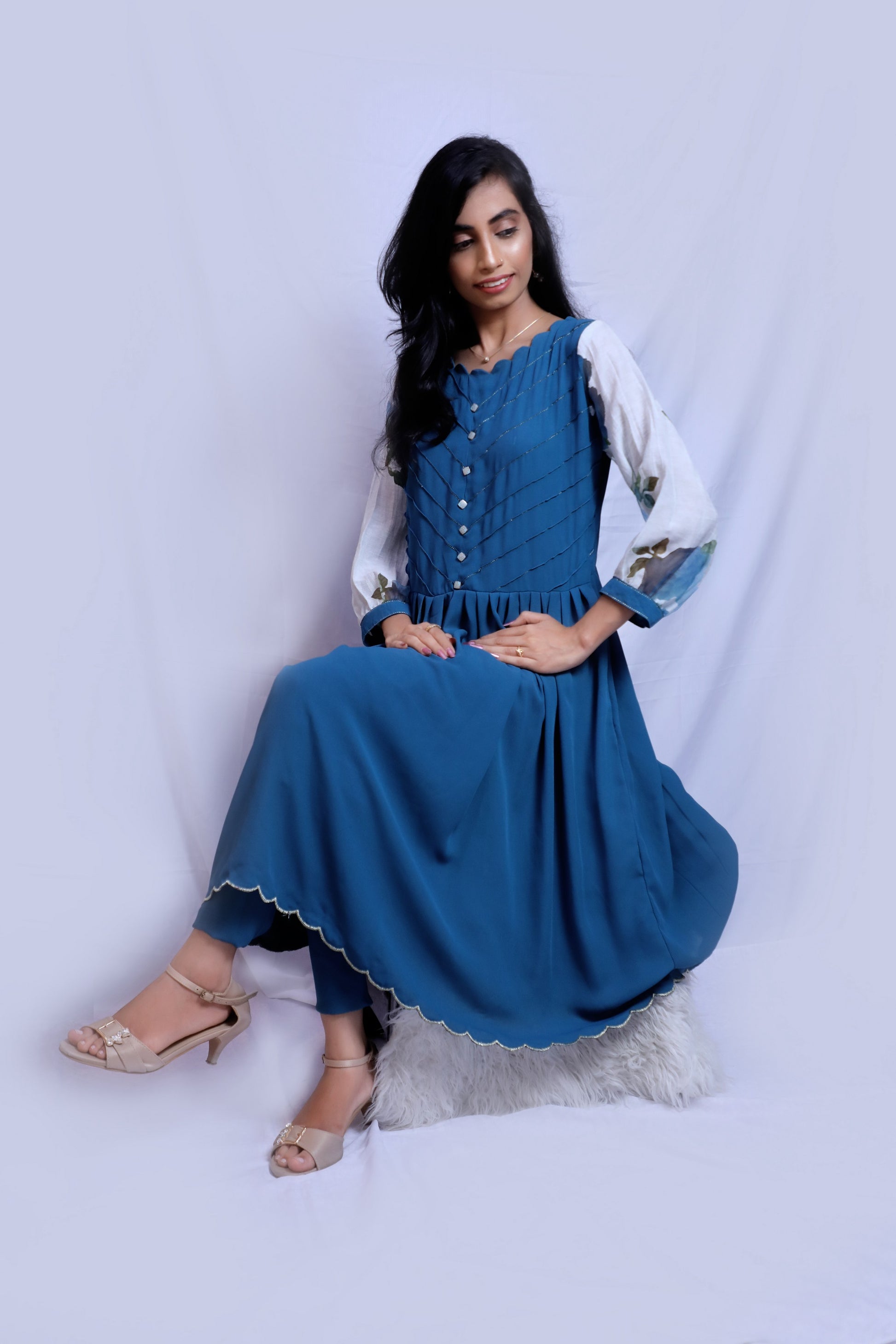 Make your look perfect with our long frock with detail work on neck, gher and frock body.