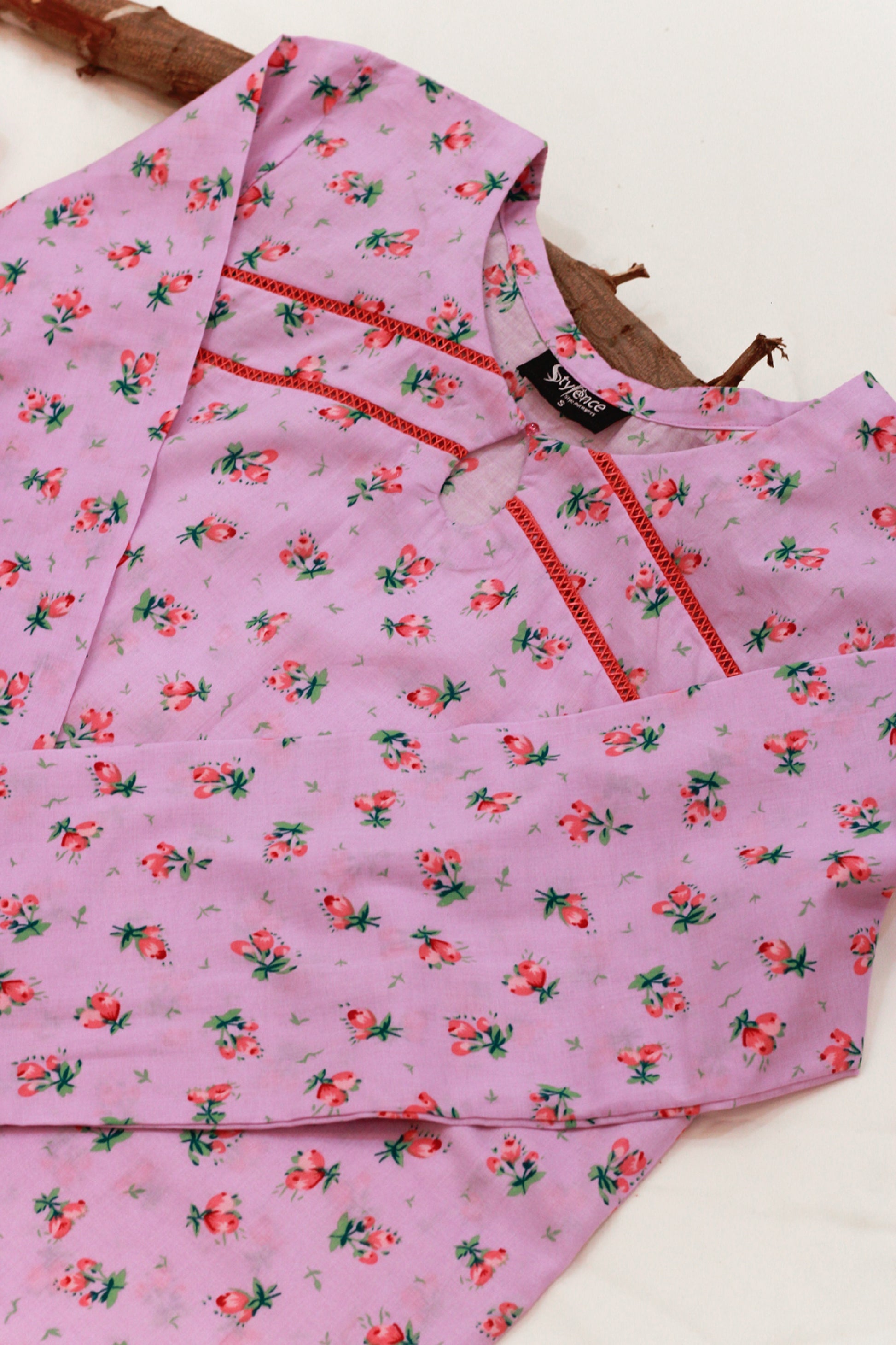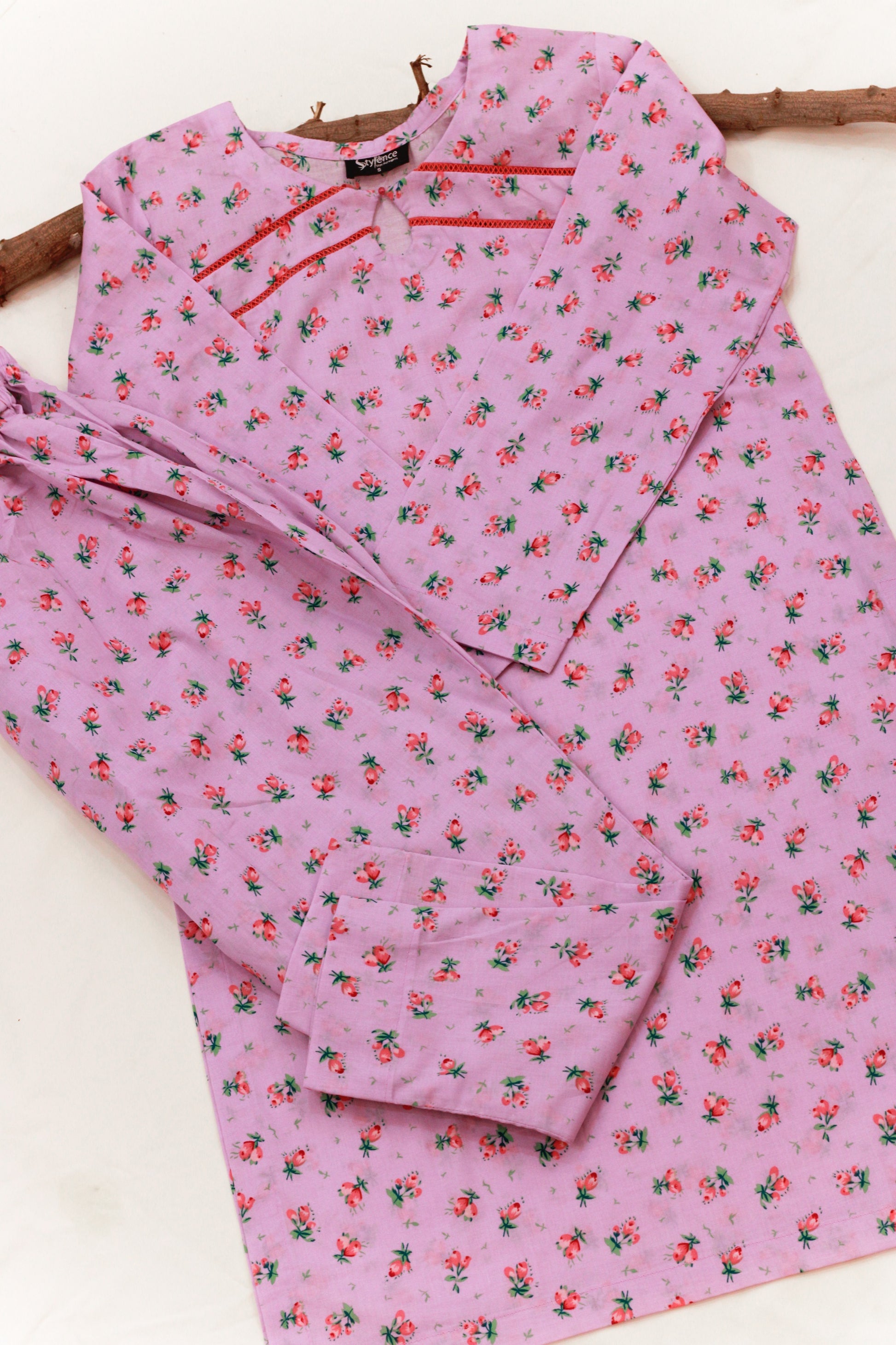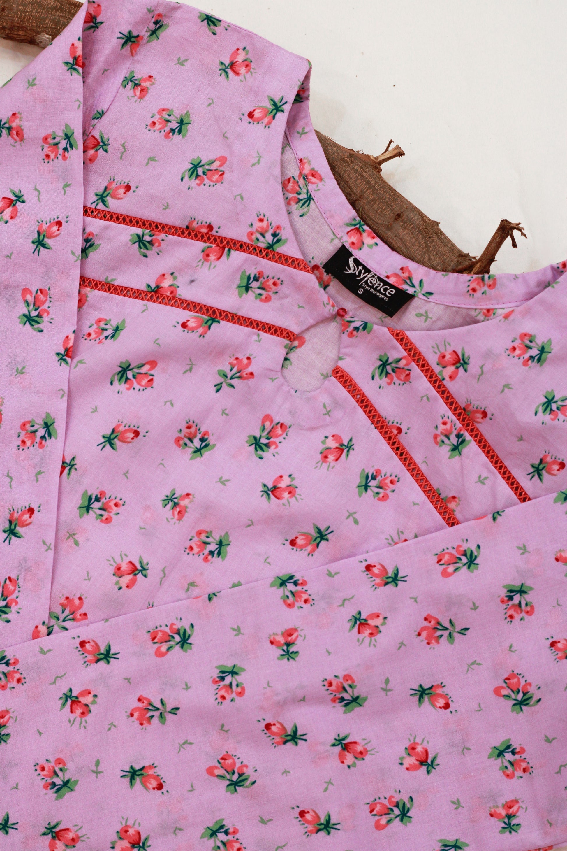 Lilac flowered printed 2 piece outfit designed with a lace and pearl on neck pairing with printed straight trouser.
