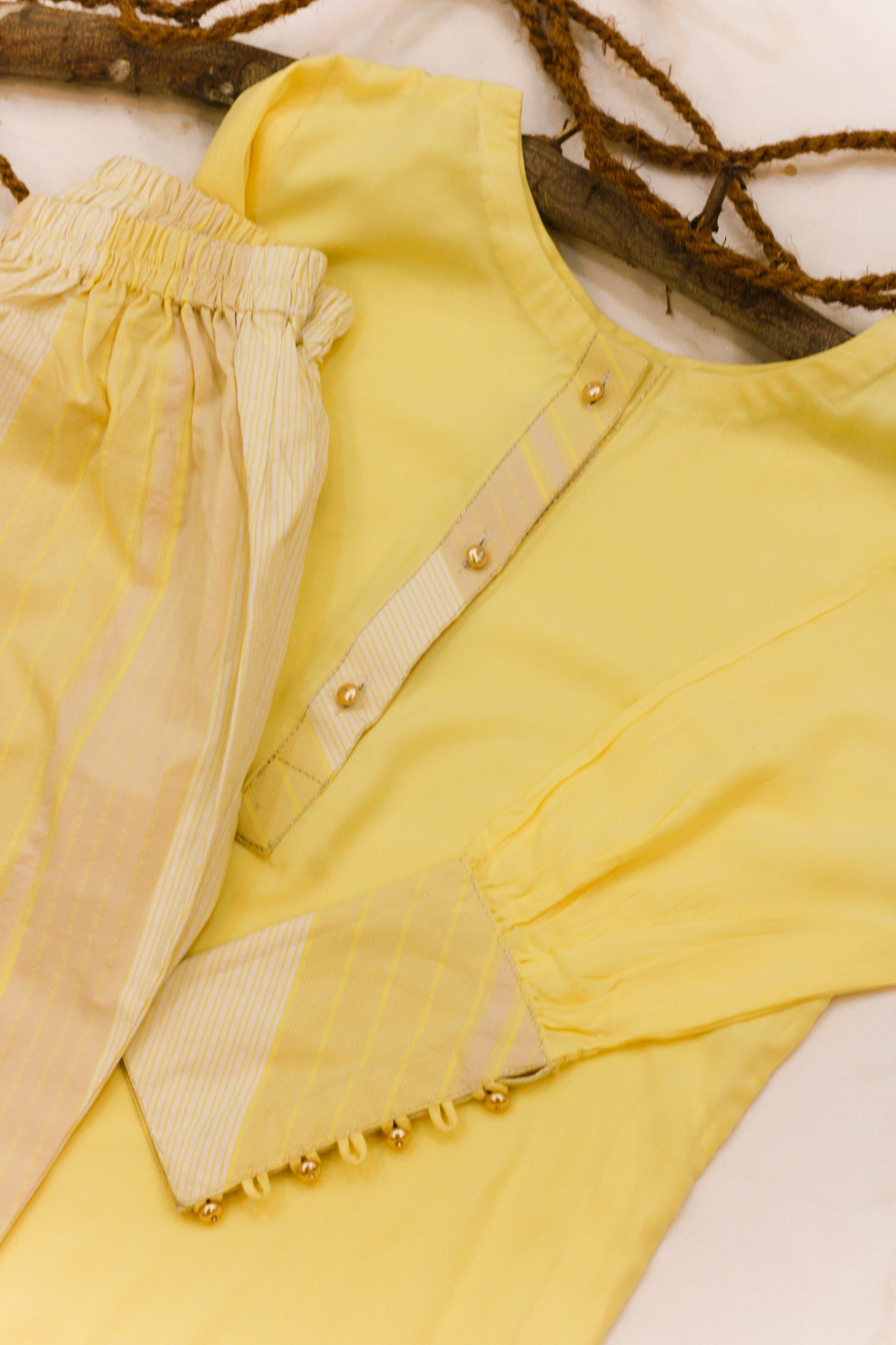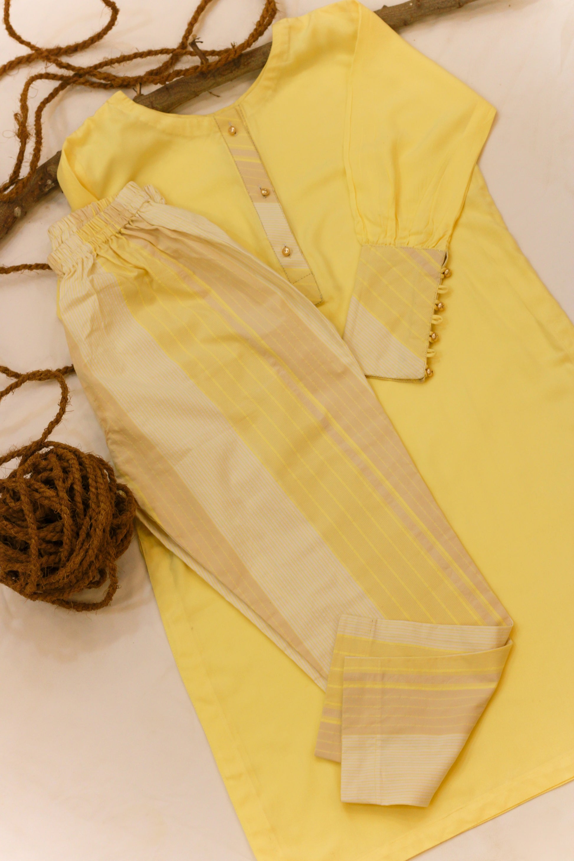 Get the positive sunshine look with our 2 piece stitched outfit with detailing on sleeves and neck line enhanced with gold button paired with lining straight trouser.