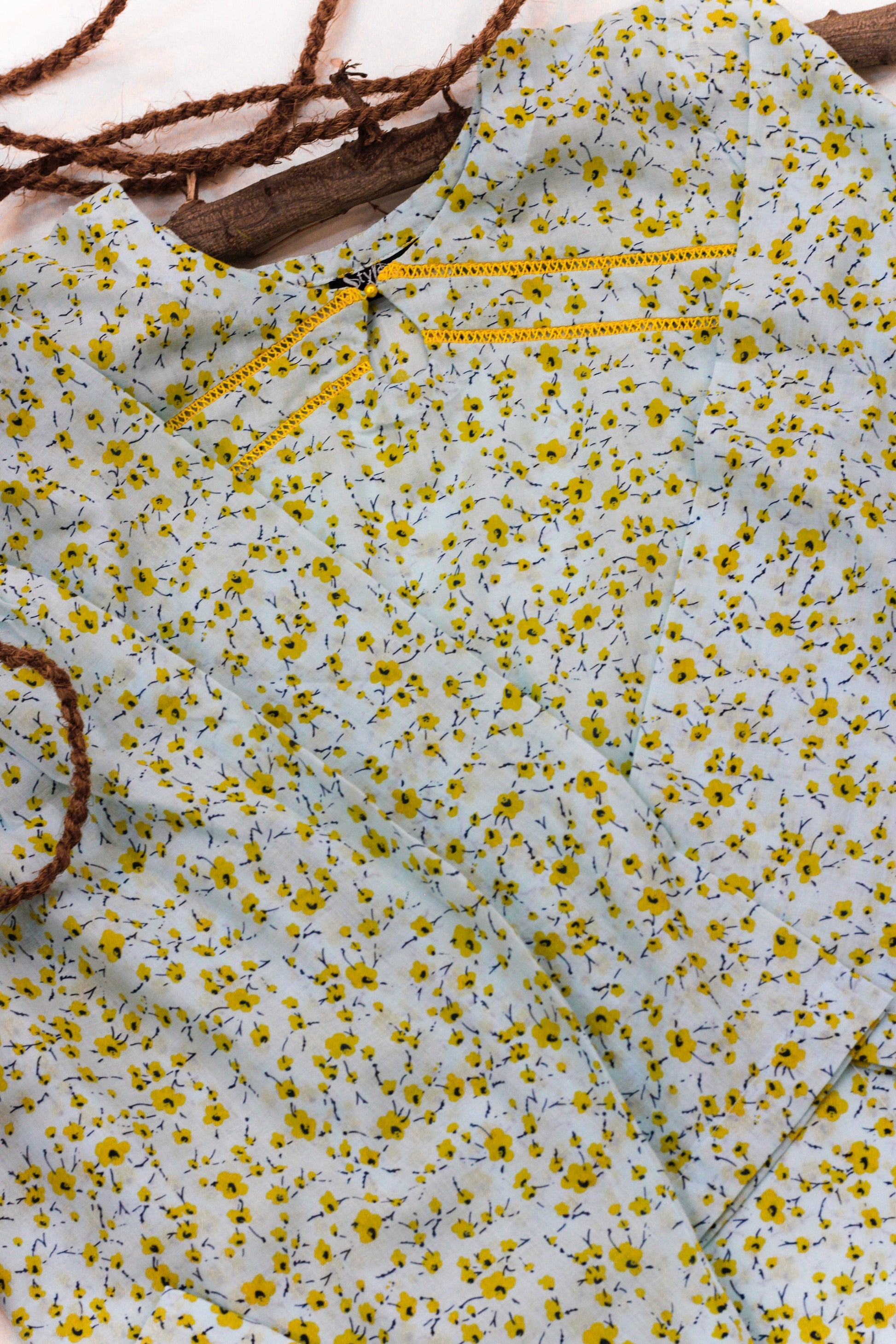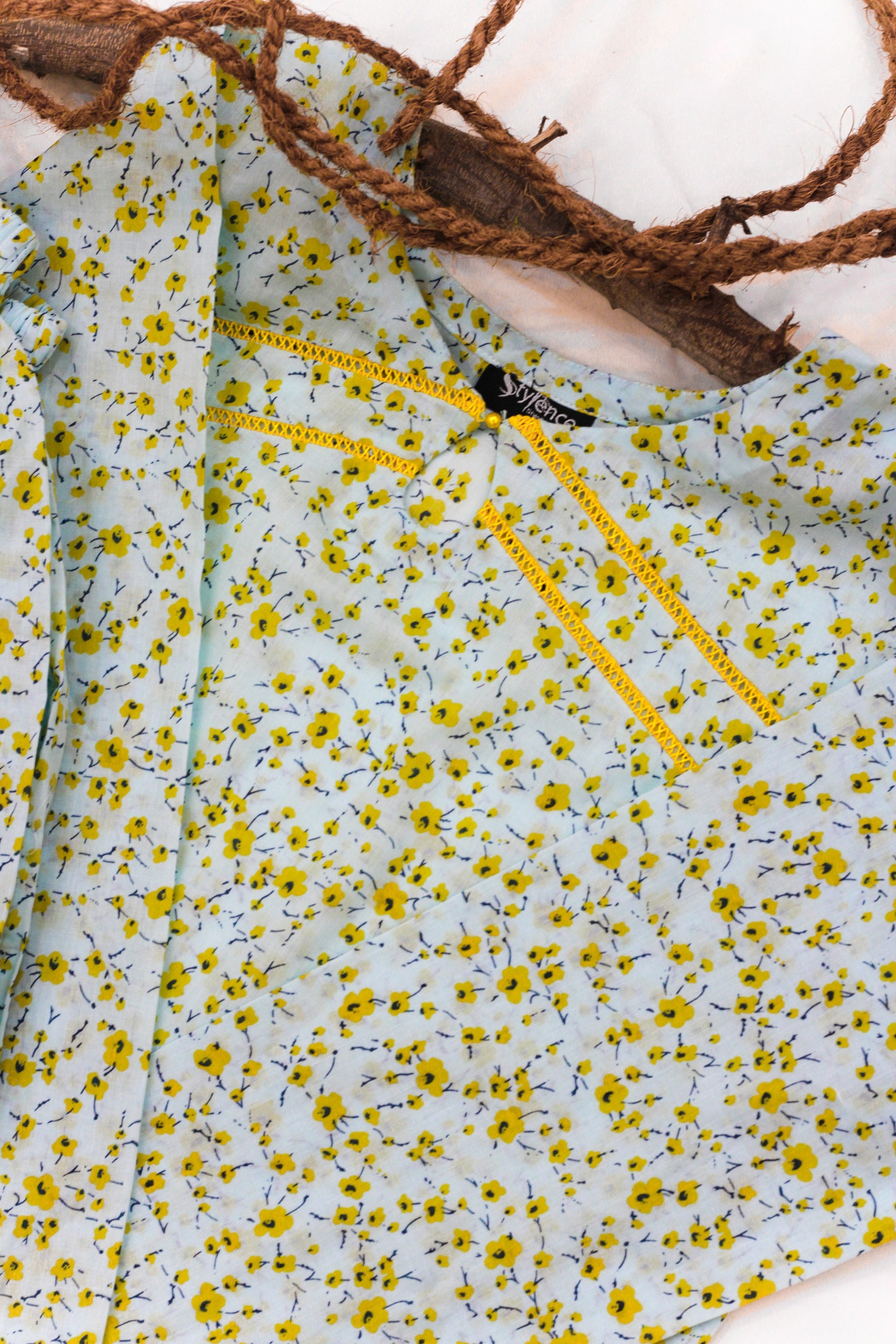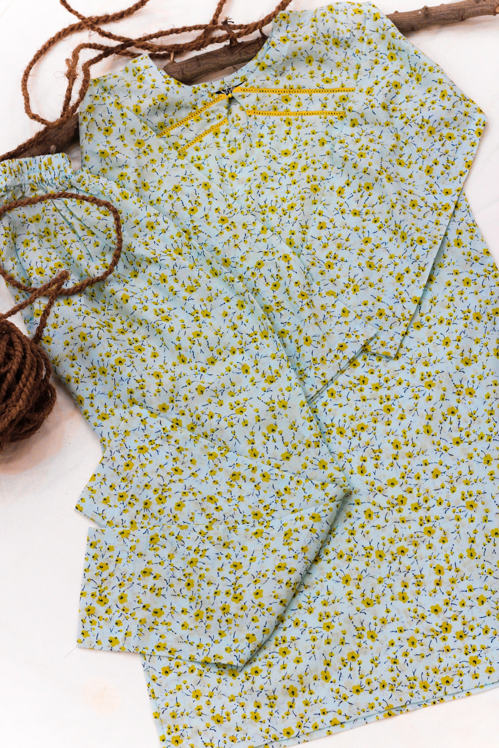 Turquoise flowered printed 2 piece outfit designed with a lace and pearl on neck pairing with printed straight trouser.